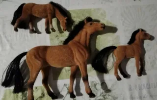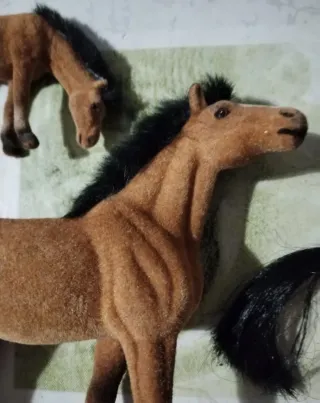 Conjunto de tres figuras de caballos hechas de fieltro. -Buen estado general. A las colas le falta un poco de peinado. Dos miden entre 10 y 11 cms y el otro unos 18 cms aproximadamente. - Diseño vintage. - Color marrón.