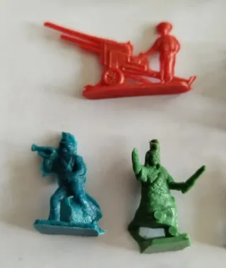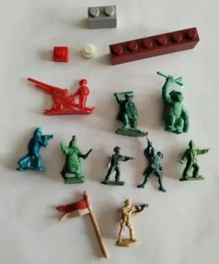 Conjunto de figuras en miniatura de soldados y guerreros a escala 1/72, ideal para coleccionistas. - Incluye piezas de plástico de diferentes colores. - Variedad de figuras con distintas poses y armamento. - Algunas piezas de construcción tipo Lego incluidas. -Todas las figuras en buen estado únicamente estandarte con falta de color parcial.