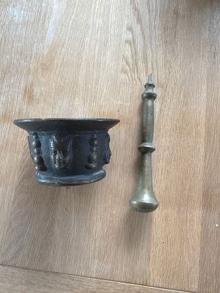 Este mortero antiguo está hecho de bronce y viene con su mano. - Material: Bronce. - Diseño clásico. Diámetro 11,5 cm, altura 7 cm