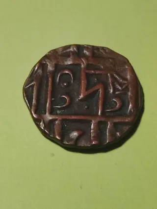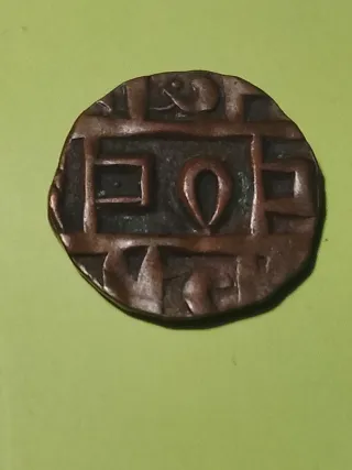 Moneda antigua de origen desconocido. - Diseño con inscripciones. - Material metálico.