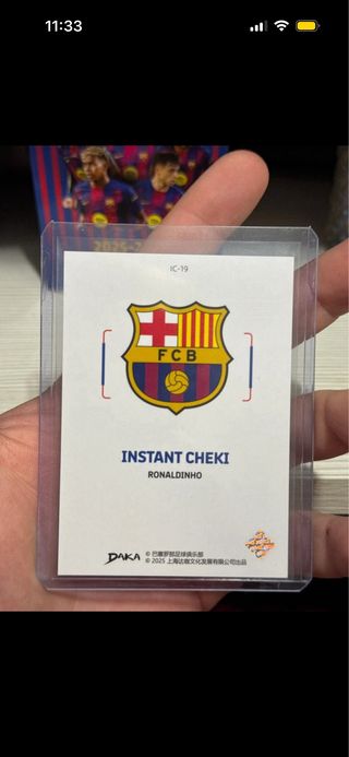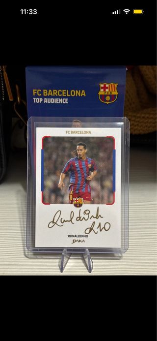 Tarjeta de colección del FC Barcelona con la firma de Ronaldinho. - Firma dorada de Ronaldinho. - Incluye el número 10. - Nombre del jugador: Ronaldinho. - Nombre de la marca: Daka.