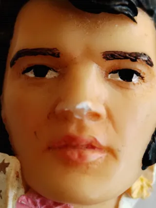 Este imán de nevera presenta un busto en 3D de Elvis Presley. - Fabricado en resina. - Diseño detallado del rostro y cabello. - Incorpora elementos decorativos en el cuello como flores y estrellas. -Presenta leve falta en nariz y flequillo resto muy bien.