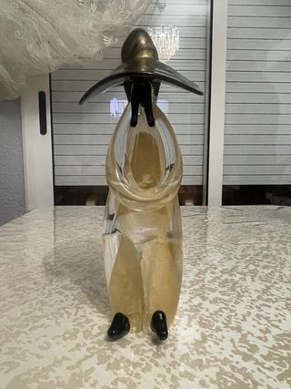 Conjunto de tres figuras decorativas de cristal con un diseño inspirado en la cultura mexicana. Cada figura tiene un sombrero ancho y un cuerpo translúcido con detalles dorados. - Material: Cristal Murano - Diseño: Figuras con sombrero. - Color: Dorado y transparente. Precio negociable