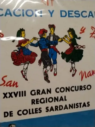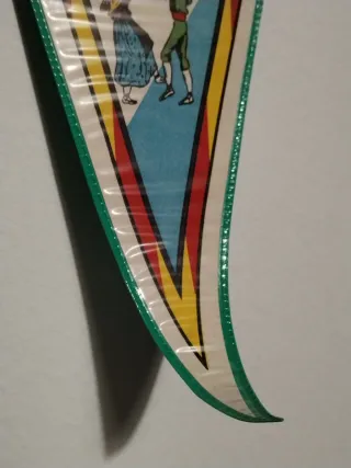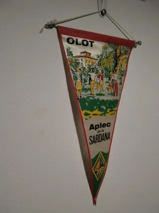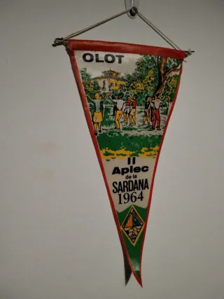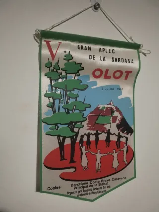 Banderín triangular conmemorativo de Olot. - Diseño con ilustración de personas bailando sardanas. - Texto Olot y Aplec de la Sardana visible. - Incluye escudo o emblema en la parte inferior. -Perfecto estado salvo punta algo viciada. Tela tipo lona medida standard.