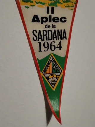 Banderín conmemorativo del II Aplec de la Sardana celebrado en Olot en 1964. Presenta una ilustración de personas bailando sardanas en un entorno natural con una casa al fondo. - Diseño triangular. - Texto: OLOT, II Aplec de la SARDANA 1964. - Incluye un escudo en la parte inferior. -Perfecto estado. Tela tipo lona. Medida standard.
