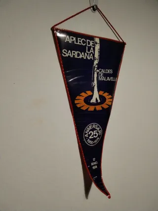 Banderín conmemorativo del Aplec de la Sardana en Caldes de Malavella. - Diseño con imagen de un instrumento de viento. - Destaca el XXV Aniversari (1950-1974). - Fecha: 12 de maig de 1974. -Perfecto estado. Plastificado. Medida standard. Punta algo viciada.