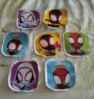Lote de 7 unidades de yogures Danone Spidey Amazing Friends de Marvel. - Diseño de Spidey, Miles Morales y Ghost-Spider. - Fecha de consumo preferente: 29/06. -Se ofrecen 7 tapas yogur de los 8 que componen la colección de Danone Spidey amazing friends Marvel.