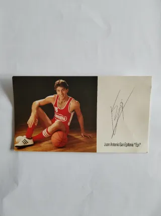 Postal de coleccionismo de Nocilla con autógrafo del jugador de baloncesto Juan Antonio San Epifanio Epi. - Imagen del jugador en acción. - Firma original de Epi. -Mide 16x9 cms aproximadamente. Uso normal. Sin escritos.
