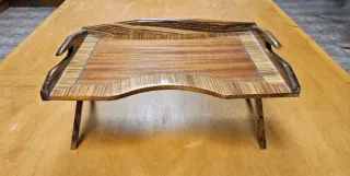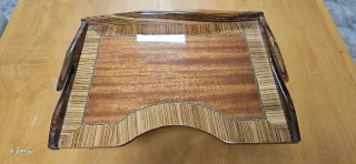 Bandeja antigua con un diseño de marquetería y patas. - Elaborada con maderas de diferentes tonalidades. - Borde decorado con detalles de marquetería. - Patas finas y estables.
