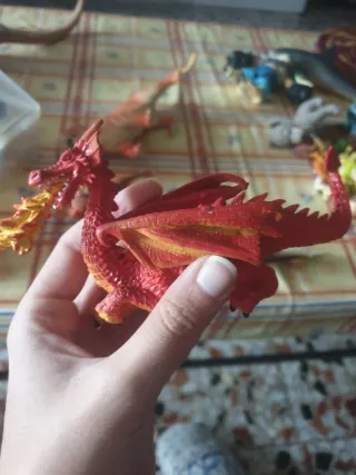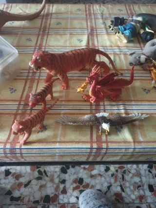 Conjunto de figuras de animales. - Figura de tigre con rayas naranjas y negras. - Figura de dragón rojo con alas. - Figura de águila con alas extendidas.