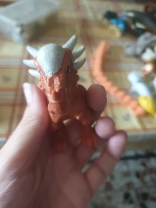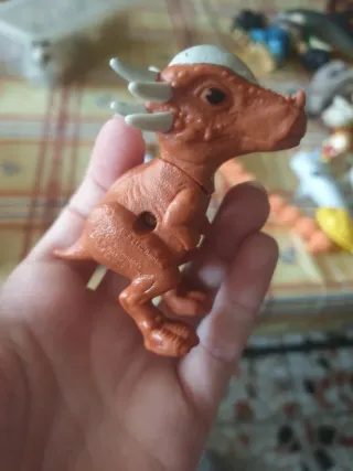 Figura de dinosaurio de la colección de Mc Donalds. Es de color naranja con detalles en blanco en la cabeza y cuernos. - Figura de plástico. - Diseño de dinosaurio con cuernos.