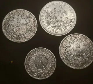 cuatro monedas francesas. 2-2 Francos Ceres 1881- 35e c/u 1 franco Ceres 1887 raro- 25e 5 francos Semeuse 1961- 28e Muy buena conservación - Diseño de Ceres/Semeuse. - Grabado République Française.