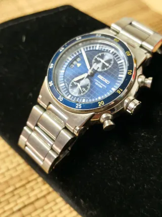 Reloj Seiko con cronógrafo y resistencia al agua de 100 metros. Esfera azul. - Bisel giratorio azul. - Correa de acero inoxidable. - Indicadores luminosos. Con signos de uso Seiko de colección... funciona bien..