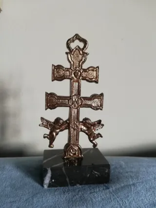 Cruz protectora de Caravaca, con detalles en esmalte rojo y verde. - Diseño con dos ángeles. - Base de mármol negro. - Inscripción Recuerdo de Caravaca., contando el pedestal son, 13×6 cm.