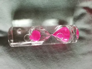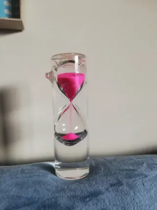 Elegante reloj de arena de vidrio con un diseño único de los años 70. Perfecto como pieza decorativa. Unico Dentro hay agua - Material: Vidrio. - Color de la arena: Rosa vibrante.