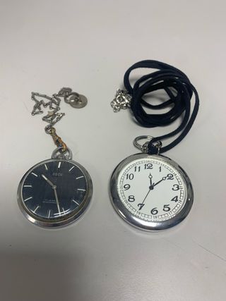 Dos relojes de bolsillo con cadenas. - Un reloj OSCO con esfera oscura y detalles plateados. - Es de rosca para darle cuerda. - Un reloj con esfera blanca, números arábigos y un cordón negro. - Este es de pila. Nueva.