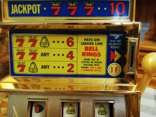 Máquina tragaperras de juguete antigua, modelo Casino Seven. Un objeto decorativo con un diseño clásico. 33 de alto 16,5 ancho 20 de fondo - Cuerpo principal en color dorado. - Detalles en azul y rojo en el frontal. - Palanca lateral para accionar los rodillos. - Compartimento para monedas y para el retorno.