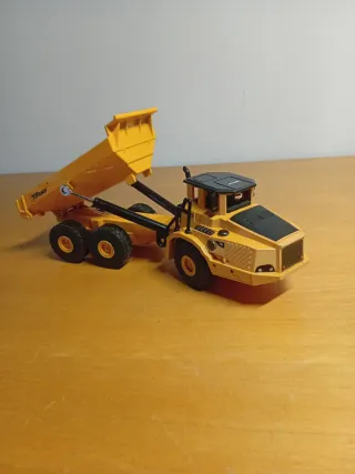 Camión volquete articulado. - Fabricado en metal. - Color amarillo. - Diseño detallado.