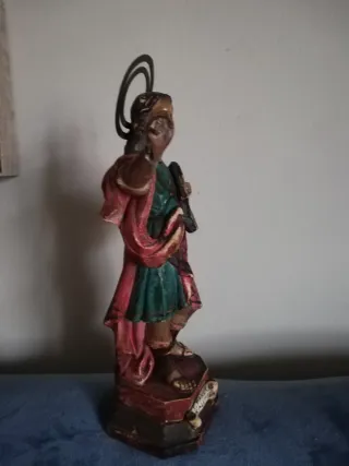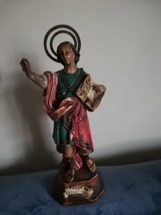 Figura religiosa antigua de San Cristóbal. Representa al santo con un libro y aureola. - Base con inscripción. - Colores vivos y detalles pintados a mano.medidas 26e alto 10 de ancho 7 de fondo.