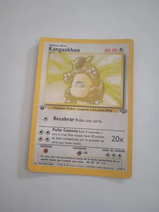 Carta Pokémon Kangaskhan primera edición española jungla brillante PI 90 N°115 5/64 la carta no está plana está un poco en forma tuvo por decirlo así un poco tampoco curvada pero está en buen estado por la parte de atrás tiene una esquina blanca se ve en la última foto
