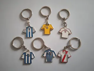 Llaveros liga española antiguos de 2004, forma de camiseta con la camiseta primera y la suplente en cada cara, a 2€ cada uno, equipos: rayo vallecano, Recreativo de Huelva, deportivo de a Coruña, Sevilla , Villarreal y Málaga, hago envios