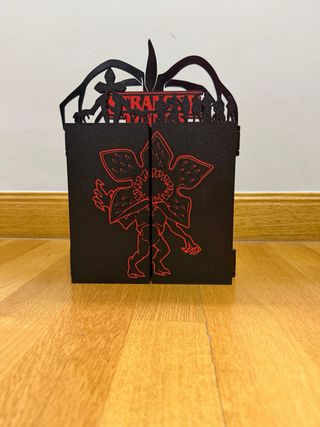 Expositor temático de Stranger Things con compartimentos para personajes. - Diseño inspirado en la serie. - Compartimentos con nombres de personajes: Demogorgon, Eleven, Vecna, Steve & Robin, Mike, Nancy, Will, Dustin, Max, Hopper, Erica, Eddie, Lucas y Robin.