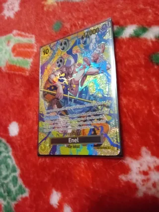 Carta de personaje de Enel del juego de cartas coleccionables One Piece. - Número de carta: OP15-060. - Poder: 8000. - Coste: 6. - Habilidad: Blocker y Activate: Main DON!! -1. - Origen: Sky Island.