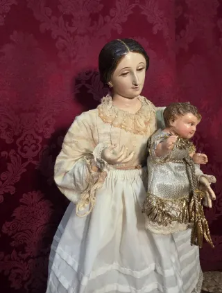 Preciosa Virgen capipota realizada en madera con ojos de cristal y pestañas, mide contando la peana 39 cm, le falta un trocito de dedo de la mano que sujeta al niño. El niño también está realizado en madera y mide 10 cm, se vende con corona y la tunica bordada que aparece en la foto.