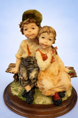Figura decorativa de dos niños sentados en un banco, elaborada en estilo Capodimonte. Representa una escena tierna y detallada. - Detalle de vestimenta y peinado. - Base con acabado de madera. Etiqueta de garantia MEDIDAS:23 x 20 con peana