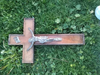 Precioso crucifijo antiguo con figura de Cristo. - Base de madera. - Figura de Cristo en metal. - Detalles ornamentales en el marco.