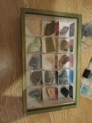 Conjunto de minerales y rocas, ideal para coleccionistas o aficionados a la geología. Incluye una caja organizadora y una bolsa de tela. - Diversidad de especímenes minerales. - Caja de plástico transparente con compartimentos. - Bolsa de tela con cierre de cordón.