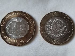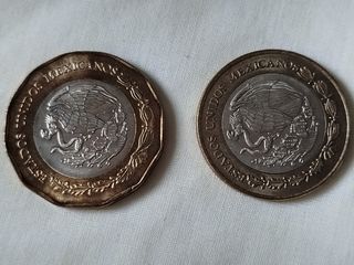 Dos monedas mexicanas de colección, una de 20 pesos y otra de 10 pesos. - Moneda de 20 pesos conmemorativa del Bicentenario de la Independencia Nacional (1821-2021). - Moneda de 10 pesos con el diseño de la Piedra del Sol (Calendario Azteca).