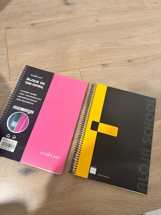 Dos cuadernos de espiral de la marca Starplast. Uno es de color rosa y el otro negro con detalles amarillos. - Cuaderno rosa: Tapa de polipropileno, microperforado. - Cuaderno negro: Tapa con diseño gráfico, 100 hojas.