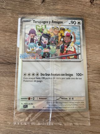 Carta promocional de Pokémon de la serie Horizontes. - Nombre: Terapagos y Amigos - PS: 90 - Ilustrador: Yamazaki Rei - Número: 1024 - Tipo: Básico - Ataque: Una Gran Aventura con Amigos (100x) - Debilidad: x2 - Resistencia: No especificada - Retirada: 2 energías