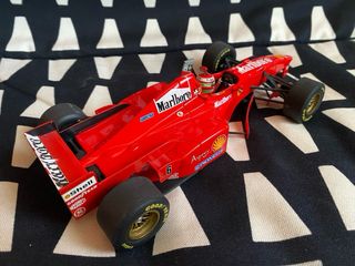 Réplica del monoplaza Ferrari F310, pilotado por Michael Schumacher. - Diseño icónico en color rojo. - Detalles de patrocinadores como Shell y Goodyear. - Número 1 en el alerón delantero. - Sin caja ENVÍO SÓLO POR INPOST