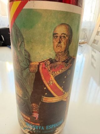 Botella de colección con la imagen de Reserva Especial, con foto de Franco - Diseño con retrato militar. - Incluye texto Reserva Especial y (Madrid).