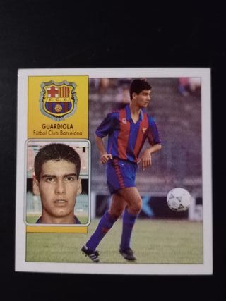 Cromo de Guardiola del Fútbol Club Barcelona. - Incluye imagen del jugador en acción. - Presenta el escudo del club.