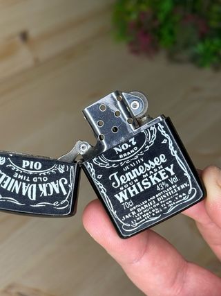 Mechero tipo Zippo con diseño de Jack Daniel's. - Color negro. - Diseño Old Time Old No.7 Tennessee Whiskey. - Detalles de la destilería Jack Daniel's. - No original - la tapa no se queda cerrada del todo
