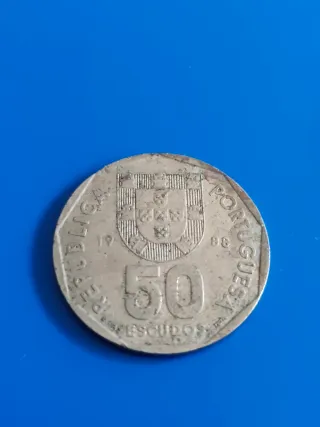Moneda de 50 escudos de Portugal. - Reverso: Escudo de Portugal. - Anverso: Valor 50 ESCUDOS y año 1988. - Canto: REPUBLICA PORTUGUESA.