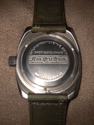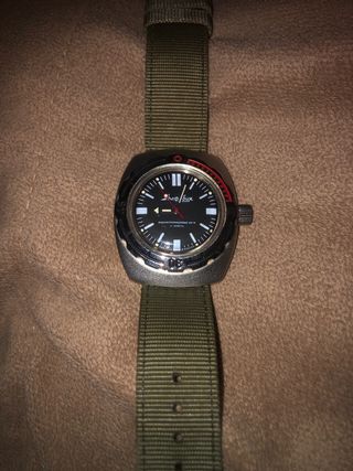 Reloj automático Vostok Amphibia con correa de nailon. - Esfera negra. - Bisel giratorio. - Resistencia al agua de 200 m. - Fabricado en Rusia.