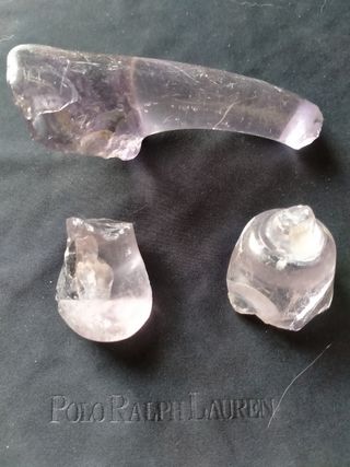 Bellos fragmentos de piezas de vidrio,(asas de jarra o jarrón y cuerpo de copa) Todas llevan un fino toque de color violáceo por su contenido en manganeso. Burbujas e irregularidades en superficies .Piezas de paredes gruesas Recuperadas antigua casa palacio en rehabilitación (osuna) Periodo :S.XVIII-XIX