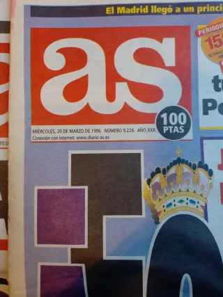 Lote de periódicos deportivos AS. - Incluye varios números con noticias de fútbol y otros deportes. - Portadas destacadas de eventos deportivos. - Publicaciones de diferentes fechas. Las fechas de los periódicos son: Domingo 13 de enero de 1991. Domingo 10 de marzo de 1991 Domingo 30 de junio de 1991 Lunes 1 de julio de 1991 Lunes 29 de junio de 1992 Jueves 11 de abril de 1996 Viernes 12 de abril de 1996 Domingo 26 de mayo de 1996 Tienen algunos desperfectos