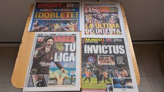 Vendo los 4 periódicos de referencia en los que el FC Barcelona se alzó con el título de Liga de la temporada 2017-18, la última de Iniesta como jugador azulgrana. Ese día el FC Barcelona ganó en Riazor al Deportivo de la Coruña por 2-4. Los periódicos están en perfecto estado y sin ninguna doblez.