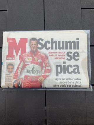 Periódico Marca del sábado 2 de abril de 2005. Portada en la que aparece Michael Schumacher durante su época en Ferrari, con Fernando Alonso (Renault) y Pedro Martínez De la Rosa (McLaren) superándolo en los entrenamientos libres del Gran Premio de Bahrein 2005. Hago envios combinados: contactar por mensaje privado.