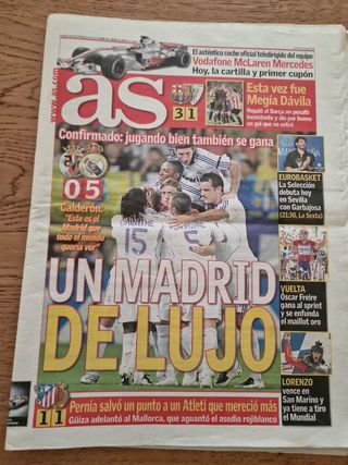 Vendo ejemplar del periódico AS del día en que el Real Madrid ganó la liga. Está en buen estado, aunque presenta algunas señales de uso. - Edición especial por la victoria del Real Madrid. - Incluye imágenes de la celebración. - Perfecto para coleccionistas.