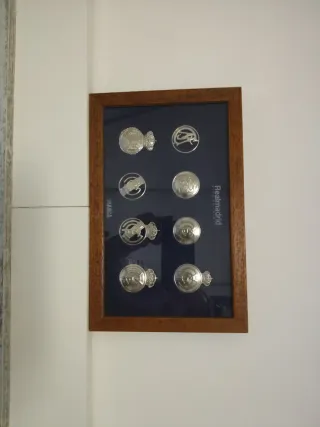 Estuche marco con cristal que contiene los 8 ESCUDOS del REAL MADRID bañados. Publicada por el periódico MARCA en la década de los 90. Completamente NUEVA. Producto oficial. Las medidas del estuche son 27,7 cm de ancho 17,8 cm de alto. Las medidas de los escudos son de cm de diámetro los redondos y de 4,5 cm de alto por 3,2 de ancho los que llevan corona.