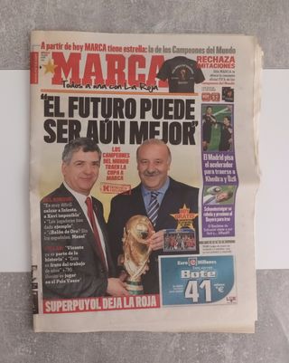 Se venden periódicos de las victorias de España en el Mundial de Sudáfrica de 2010 y en la Eurocopa de 2012, selección entrenada en ambos torneos por Vicente del Bosque. Según el orden de las imágenes, los periódicos son: • 1: Periódico Marca. Del 14 de julio de 2010. • 2: Periódico As. Del 14 de julio de 2010. • 3: Periódico Marca. Del 3 de julio de 2012. Los periódicos se encuentran completos y en buen estado. Cada periódico se vende por 3€. Todos por 7€. Se hacen envíos a través de Wallapop.