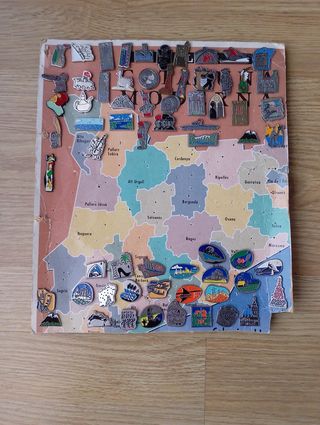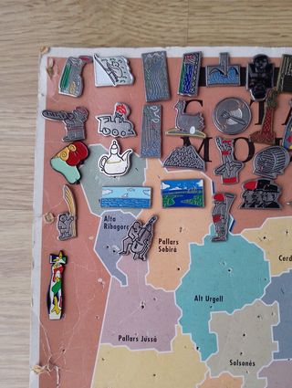Colección de 42 pins de Cataluña Moderna del periódico El País, diseñados por Perico Pastor. - Cada pin representa una comarca catalana o la zona mediterránea. - Incluye el mapa de Cataluña con la ubicación de cada comarca. - Publicación original de El País y la Caixa.