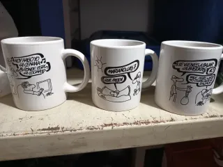 Juego de tres tazas de cerámica con ilustraciones de Forges, promoción del periódico El País. Son tazas bonitas y están en buen estado. - Tres tazas de diseño elegante. - Ilustraciones de la historieta de Forges. - Perfectas para el desayuno o el café.