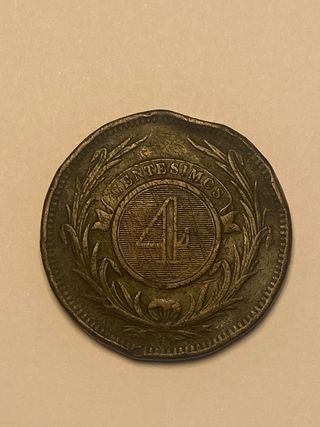 Moneda de 4 centésimos de Uruguay, acuñada en el año 1869. Ficha: - País: Uruguay - Período: Peso (1862-1974) - Moneda: Peso uruguayo - Denominación: 4 centésimos - Año: 1869 - Aleación: Bronce - Canto: liso - Marca: A (Marca de ceca “A” - París - Tirada: 2.000.000 unidades Ver fotos para los detalles del estado.